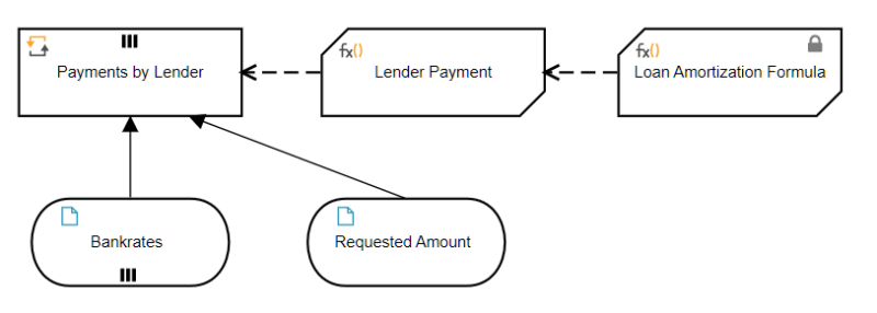 The BKM Lender Payment uses a context boxed expression with no final result box to create each row of the table. The context entry Monthly Payment invokes another BKM, Loan Amortization Formula, which calculates the value based on the adjusted loan amount, the interest rate, and fees.