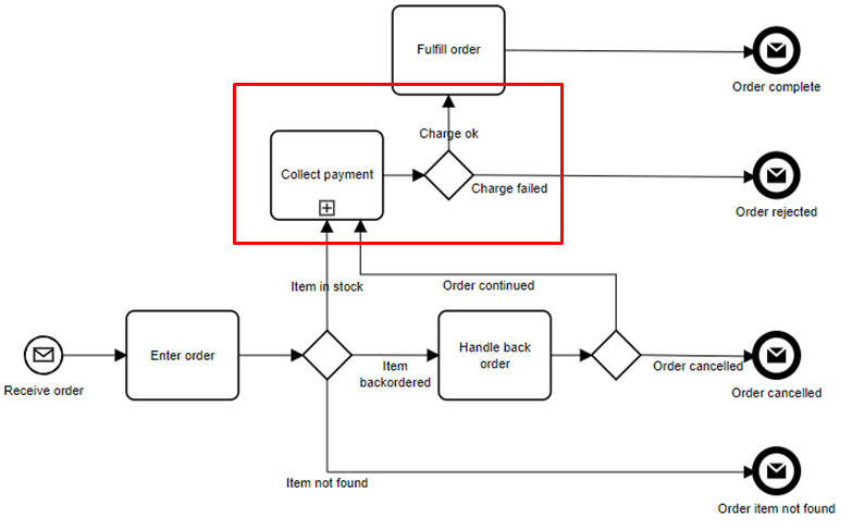 While constraints like these might seem overly restrictive at first, in practice it turns out they are not. Their value is that they allow the consumer of your BPMN models to trace the logic from parent level diagram (with gateways) to child level diagram (with end states) in a simple mechanical way, by matching the text labels. Here is an example. In the top-level process diagram below, Collect payment is followed by a gateway with gates Charge ok and Charge failed. Method and Style says that means that Collect payment has two end states - two different ways it could end - called Charge ok and Charge failed.