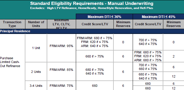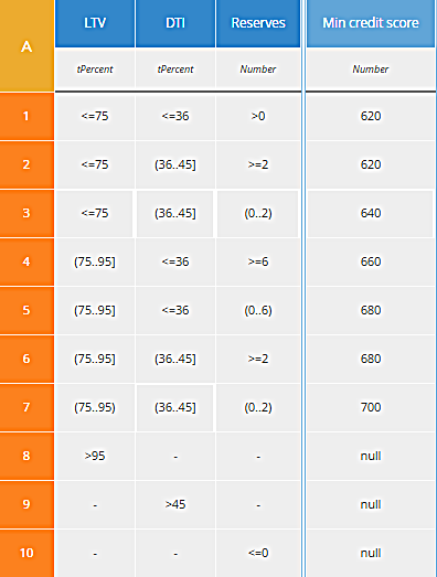 Values of LTV over 95%, DTI over 45%, or Reserves less than zero are always ineligible, so the minimum credit score for those is null.