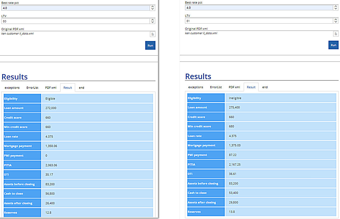 We can deploy this BPMN process in one click as an executable microservice in the Trisotech cloud. When we run it with an LTV of 80%, Ken is Eligible for the loan. That's the service output shown below on the left. But if we bump it up just slightly to 81%, as shown on the right, the minimum credit score required jumps to 680 and Ken is Ineligible. This slight increase in loan amount pushes DTI above 36% and also requires private mortgage insurance (PMI). Thus we can report to Ken that the maximum he can borrow for this property is $272,000, or LTV 80%.
