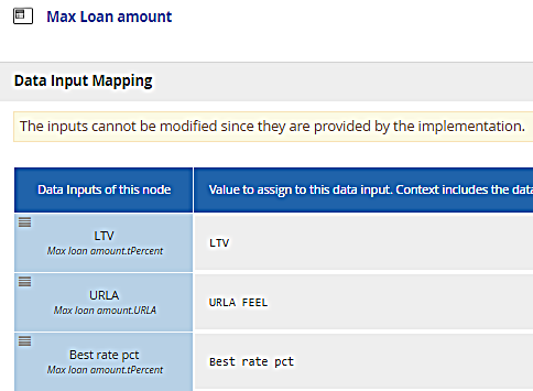 Executable modeling by non-programmers is a basic feature of DMN, but BPMN historically has required programming to make it executable. Trisotech, however, has borrowed FEEL and boxed expressions from DMN to let non-programmers create executable processes like this one. Just like invocation mappings in DMN, the tool provides boxed expressions to map between BPMN data objects (variables) and task data inputs/outputs. For example, below you see the mapping from the process data objects LTV, URLA FEEL, and Best rate pct to the corresponding DMN input data elements. In this case the mapping is trivial, but as in DMN, any FEEL expression can be used.The Bottom Line