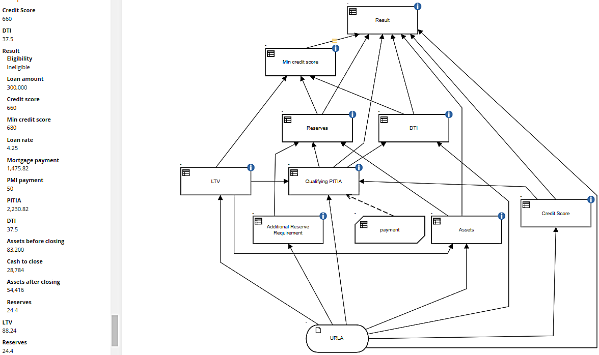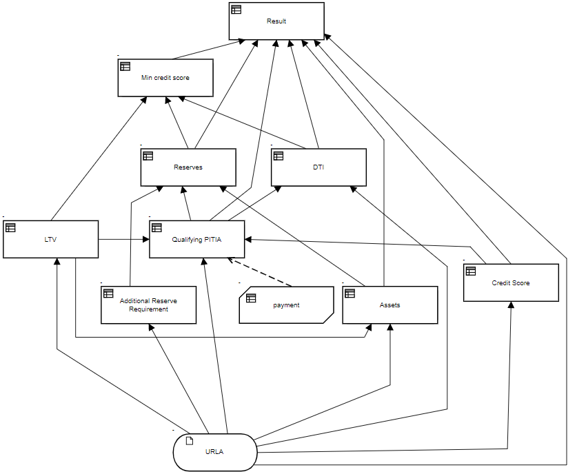 Of course, LTV, DTI, and Reserves are derived values, not raw data reported in URLA. As is usually the case, the bulk of the DMN Decision Requirements Diagram (DRD) is deriving those values from the input data, based on the calculations detailed in the Guide on Fannie's website. That DRD is shown below: