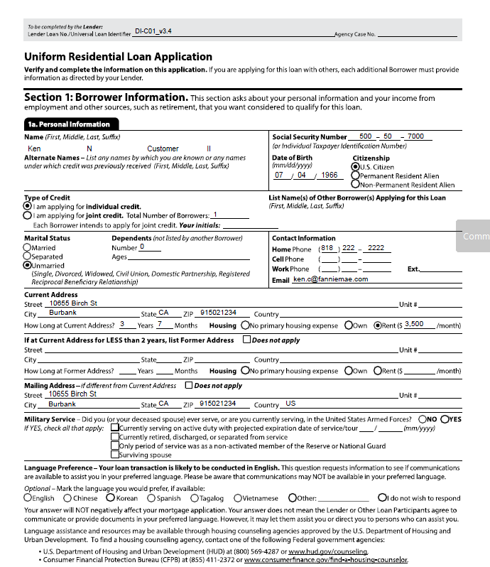 This is just page 1 of Ken's URLA form, which contains many pages detailing the various sources and types of his income, assets and liabilities, plus details of the loan, property value, and cash required at closing entered by the lender. On delivery to Fannie, this data is formatted as MISMO XML. Ken wants to borrow $300,000 for a $340,000 purchase, and we've assigned him a credit score of 660.