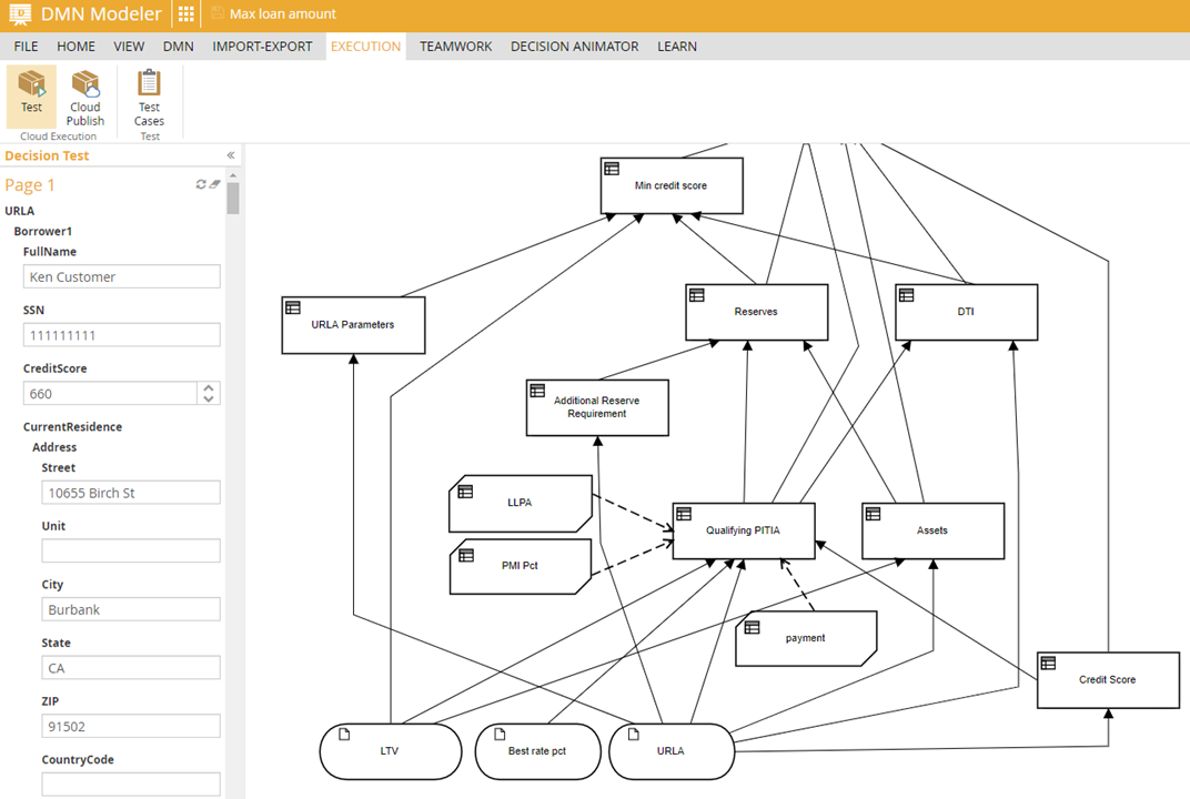 We can test the logic by entering input data values in the form here on the left and running the model. Recall that Ken did not qualify for 300,000, but for a loan amount of 272,000, corresponding to LTV of 80%, Ken’s credit score of 660 is equal to the required minimum, so he is eligible at this LTV. Once testing gives confidence that the model is correct, it can be published in one click as an executable decision service we could call for any borrower given URLA and the current best interest rate.