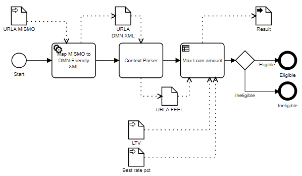 We can model those steps as a process in BPMN and deploy the whole thing as a REST service that takes MISMO data as input and outputs the result of our decision. It looks like this:The first activity is a service that maps MISMO XML to our DMN-friendly schema. You can write a program to do this, or use a tool like Altova MapForce to create the mapping graphically. The output of that task, here called URLA DMN XML, is passed to the system task Context Parser, which converts the XML to FEEL. The decision task Max Loan amount simply executes the DMN model we showed earlier, with its three input data elements URLA, LTV, and Best rate pct. The DMN decision Result is passed to the process data output, which is also tested by a gateway to provide process end states Eligible and Ineligible.