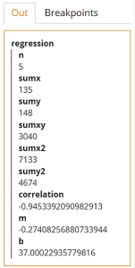 n = count(Dataset)sumxy = sum(for i in 1..n return Dataset.x[i]*Dataset.y[i])sumx = sum(Dataset.x)sumy = sum(Dataset.y)sumx2 = sum(for i in 1..n return Dataset.x[i]**2)