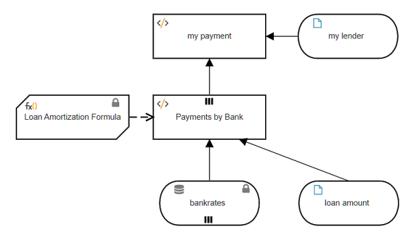 As an example, suppose we have a table of available 30-year fixed rate home mortgage products, differing in the interest rate, points (an addition to the requested amount as a way to "buy down" the interest rate), and fixed fees. You can find this data on the web, and the rates change daily. In our decision service, we want to allow users to find the current rate for a particular lender, and in addition find the monthly payment for that lender, which depends on the requested loan amount. Finding the lender's current rate is a basic lookup of unmodified external data. Finding the monthly payment using that lender requires additional calculation. Let's look at some different ways to model this.