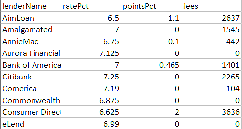 We can start with a table of lenders and rates, either keyed in or captured by web scraping. In Excel it looks like this:
