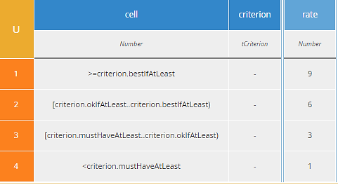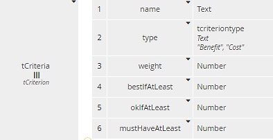 Input data Criteria is a table, collection of tCriterion, shown below. The last three components are used, for certain criteria only, to convert between numeric measures and a rating. For Benefit criteria it makes the assumption that a higher number is better, which is not always the case, so this aspect could be improved.Figure 7. Type tCriteria includes components used in Rated