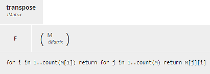 for i in 1..count(M) return for j in 1..count(M[1]) return <<cell value>>The outer for loop iterates over an index to rows of the matrix M. The inner for loop iterates over an index to the columns, modeled as the items in a row of the matrix.