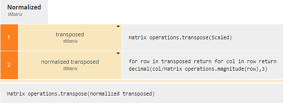 Decision Normalized, from the original TOPSIS algorithm, divides each cell in Scaled by the root sum squared of its column values. Since a column of the matrix is a vector, we use the imported Matrix operations.magnitude function to calculate that. As in Scaled, we use Matrix operations.transpose to work on columns and then transpose back again.Figure 15. Normalized uses transpose twice to operate on columns of Scaled