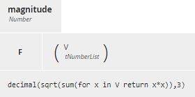 - magnitude(V), returning the root sum squared of the vector elements