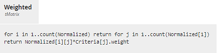 - The Weighted matrix multiplies each cell value of Normalized by its Criterion weight.