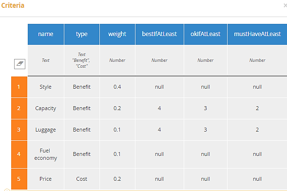 As an example, consider a rental car recommendation decision for EU-Rent. In this example, we consider Criteria to include 5 attributes, as shown below in Execution/Test:Figure 23. Rental car selection Criteria
