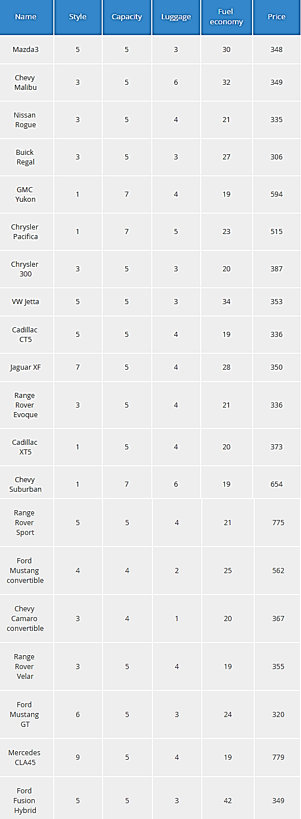“Objective” values, taken from hertz.com weekly rental in October at Boston Logan Airport, include Fuel Economy (MPG) and Price. Capacity (Seats) and Luggage (Suitcases) are “semi-objective” in the sense that the customer might not always rate a higher value as preferable. For the semi-objective attributes, Criteria asks the customer to provide values for bestIfAtLeast, which gives a rating of 9; okIfAtLeast, a rating of 6; and mustHaveAtLeast, a rating of 3. As noted previously, this logic is not the best, as a customer might rate a car seating 5 higher than one seating 7. The purely subjective attribute Style is selected by the customer as the first scoresText entry in input data Alternatives Raw: