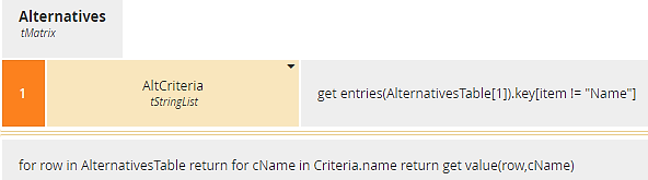 The first context entry AltCriteria generates a list of column names in AlternativesTable, applying get entries to a row of the relation and selecting the component key, returning a list of strings. We don’t want the column Name in our matrix, so we exclude it with a filter. We then iterate over rows of the relation, within each row iterating get value over a list of keys to create the matrix.