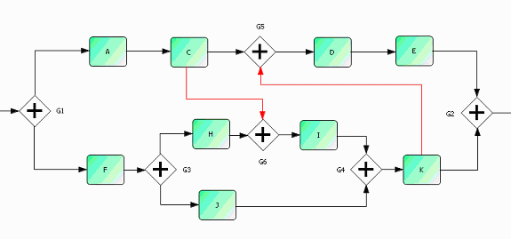 1) A-B-C-D-E => BPEL Sequence ?P1? 2) H-I => BPEL Sequence ?P2? 3) G3-(P2 | J)-G4 => BPEL Flow ?P3? 4) F-P3-K => BPEL Sequence ?P4? 5) G1-(P1 | P4) => BPEL Flow ?P5?