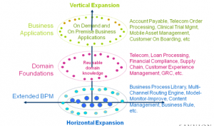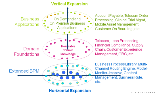 Horizontal platform extension includes new features like Project-Oriented Processes (POP), content management, business rule management, expanded process intelligence, and platform architecture for deployment in a multi-tenant/SaaS environment. Vertical expansion has two levels: domain foundations, a collection of process components applicable across applications in a vertical industry domain; and business applications themselves. Savvion will deliver a few of the applications, and will support ISVs and SIs in building the rest. So far they have 8 Solution Business Alliance partners signed up. The first domain foundation and apps will be announced tomorrow.