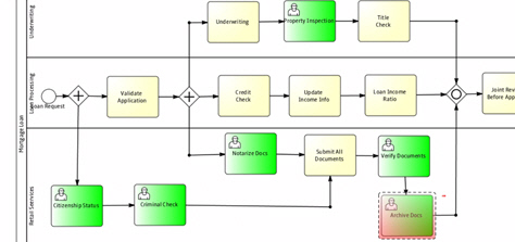 This diagram is a runtime view of a particular instance. The yellow border around Citizenship Status (and other tasks) means 'completed'. The red borders around Property Inspection and Notarize Docs means 'in progress'. Let's say at Submit All Documents the user realizes that for this instance, there should have been a Criminal Check in addition to the Citizenship Status check, and also a new future step is required, Archive Docs. Roubroo can define and add those steps to the running instance, and inject a "token" back to the Criminal Check step - which actually comes before the current location of the token.