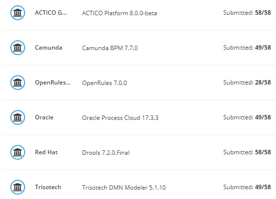 The list of tests and participating tools is updated monthly on the TCK website. Eventually it ought to become a reference point for decision management RFPs.