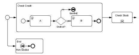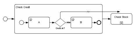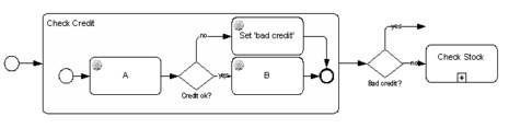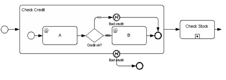Here is a familar diagram of an order handling process in BPMN - three subprocesses in a sequential flow. But when you drill down, you typically want to say that if Check Credit fails, you terminate the order. Something like this: