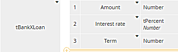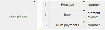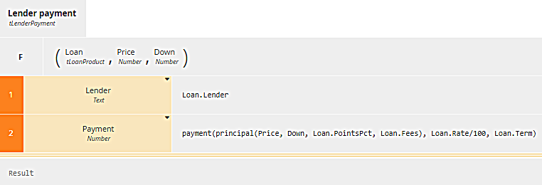 for [range variable] in [list variable] return [expression of range variable]where the range variable is simply a name meaning one item in the list - here one row of Loan Products, and the expression is a literal invocation of the BKM Lender payment. Note that the first argument is the range variable loan, again meaning a row of Loan Products, a structure with the five components shown above.