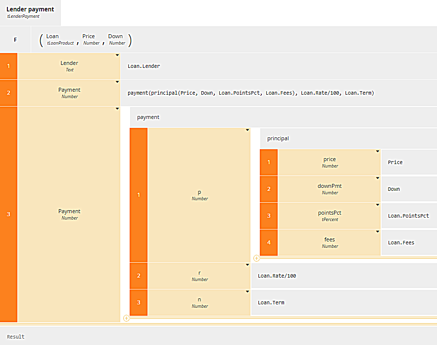 Here you see the definition of the BKM Lender payment. The parameters are Loan, Price and Down. Note the datatype of each parameter must match the type of the arguments passed in the invocation. This BKM returns a row of Mortgage payments by lender, which has two components, Lender (the lender name) and Payment. The way to create such a structure is with a context, another boxed expression type, having a row (context entry) for each component of the output, its name in the first column and value expression in the second column, and an empty final result box (the bottom row, labeled Result). The component Lender is taken from Loan, which is a row of Loan Products. The component Payment has a more complicated value expression, illustrating what you can do with BKM invocation. It invokes the BKM payment, and for the first argument invokes the BKM principal, which calculates the loan amount. In other words, Mortgage payments by lender invokes the BKM Lender payment, which in turn invokes the BKM payment and - as an argument of payment - the BKM principal.