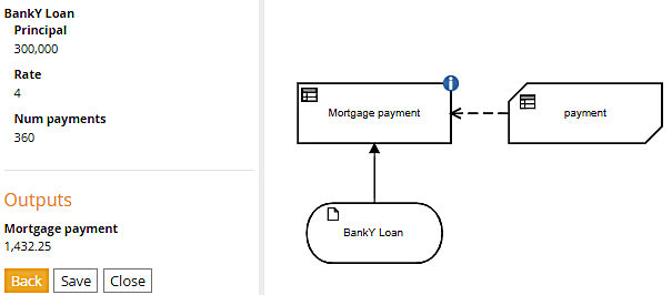 What is different in the two DRDs above is the invocation of the BKM performed by the decision Mortgage payment. The invoking decision simply has to map its inputs - here the components of either BankX Loan or BankY Loan, to the BKM parameters p, r, and n. There are two different ways to do this, and both are easy.
