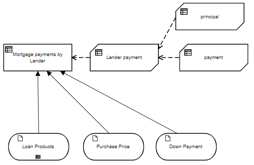 So here is a more complex DRD that involves multiple BKMs. The decision Mortgage payments by Lender returns a table of monthly payments by lender by invoking BKM Lender payment, which in turn invokes two BKMs, principal and payment. The connection of the called element to the calling element is indicated in the diagram by the dashed arrow, called a knowledge requirement. Here input data Loan Products is a table of lender offerings, specifying the interest rate, points, and fees: